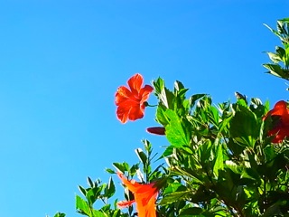 鮮やかな紅のハイビスカスとクリアな南国の青空をセレクト。