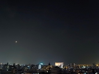 西の空にポッカリ三日月、おぼろ月夜です。