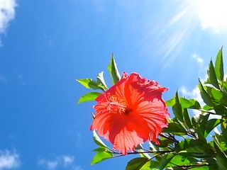 南国沖縄の太陽と空と雲とハイビスカスをセレクト。