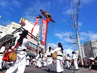 旗頭も勇壮でした! 南国の秋の空に伸びる旗頭。