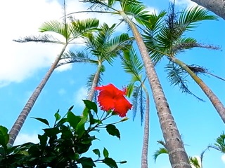 秋の空に伸びる椰子とハイビスカス@北中城。