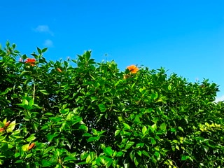 ハイビスカスの垣根と南国の青空@浦添市小湾。