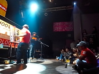 キヨサクのウクレレと歌に併せ英天が絵を描き上げる。