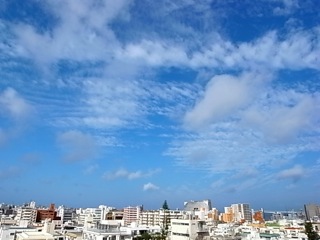 低層雲、中高層雲と青空のコントラストが美しい今日の沖縄の空です。
