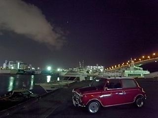 愛車のミニクーパで5分の泊大橋の袂。しばし夜景を眺めて再始動します。