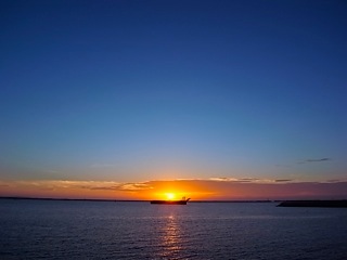 その雲の帯と水平線の間からオレンジ色の夕陽が顔を出したとたん、