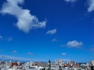 今日の沖縄の空、南の方に高層雲、そして青空の二層構造のホワイト&ブルーの空。