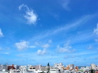 今日の沖縄の空、青空と白い雲のコントラストが美しい南国沖縄夏の空。