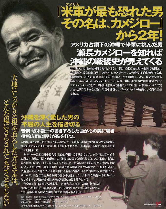 そして2019年8月、カメジローの生涯をさらに深く、そして復帰に向けた沖縄の激動を描いたドキュメンタリー映画『米軍(アメリカ)が最も恐れた男 カメジロー不屈の生涯』が公開される。
