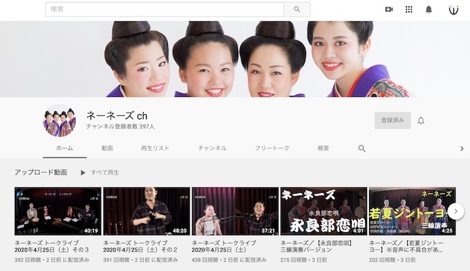 ネーネーズが出演する国際通りにある「ライブハウス島唄」がネーネーズのYouTubeチャンネル「ネーネーズch」を開設した。ネーネーズとの距離感が近い! 魅力満載のトークライブ更新中です。ぜひ、YouTubeチャンネルへアクセスしてチャンネル登録してください!!