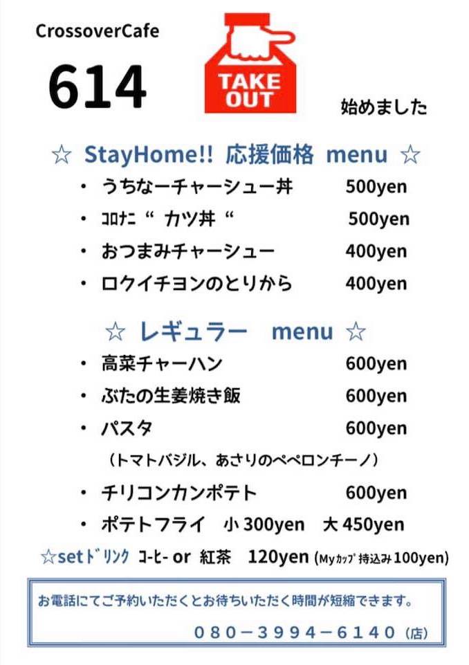 テイクアウト営業スタート| Crossover Cafe’ 614