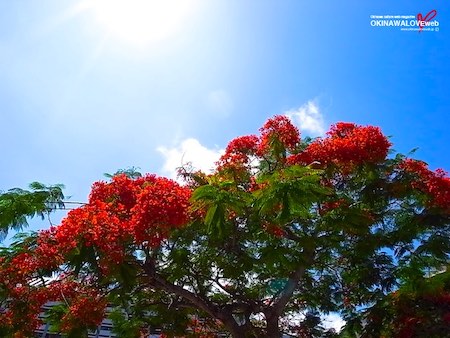 美しい鳳凰木、五月晴れの空に映えます。沖縄はグッドロケーションそこかしこ。