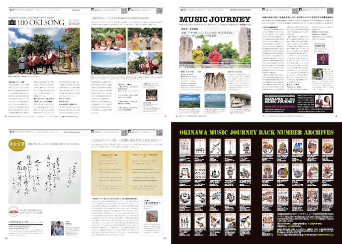 沖縄民謡に学ぶコーナー、アーティストインタビューコーナー、百沖ソングCDレビュー、ミュージックジャーニーマップなど内容満載!! 『100年先に伝えたいおきなわのうた』をキーワードに企画編集出版している雑誌 沖縄音楽旅行。沖縄の先達が紡いで来たおきなわのうたから、最新の沖縄音楽まで沖縄カルチャーの広告塔 幸田悟が責任編集でお届けしてます。ぜひ、本を手に取ってご覧下さい。