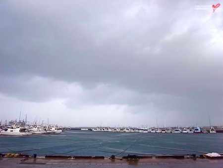 台風8号の影響で大荒れの天気の沖縄。写真は、オフィス近くのマリーナ。