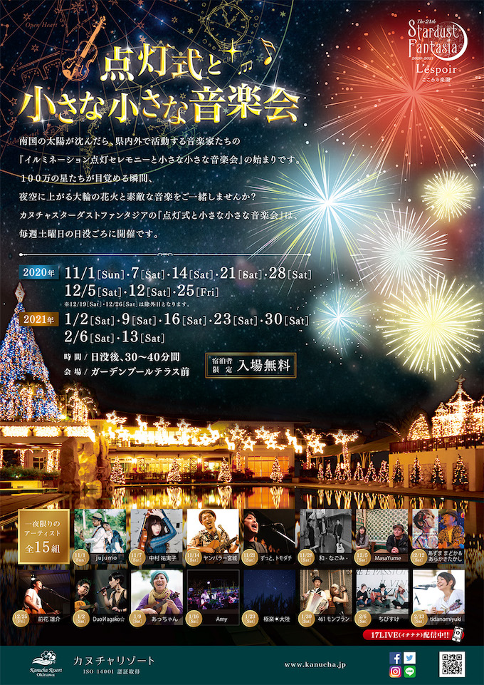 沖縄県名護市字安部にある極上のリゾート空間、「カヌチャリゾート」。100万の星たちが南国の夜を彩る「スターダストファンタジア」を今年も2020年11月1日より開催。その開催に合わせ、11月7日(土)より2021年2月13日(日)までの毎週土曜日、沖縄のアーティストたちによる「点灯式と小さな小さな音楽会」が大好評実施中です。
