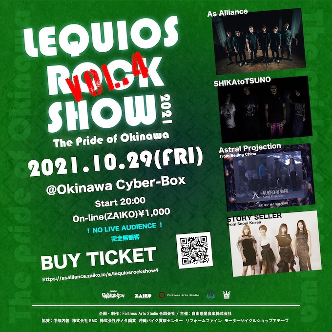 沖縄を拠点に国内外で活動するロックバンドAs Allianceによる「沖縄から世界へ」をリアルに体現するイベント「LEQUIOS ROCK SHOW」の第四弾「LEQUIOS ROCK SHOW Vol.4」が本日2021年10月29日(金)Okinawa Cyber-Boxにて完全無観客 オンライン開催される。