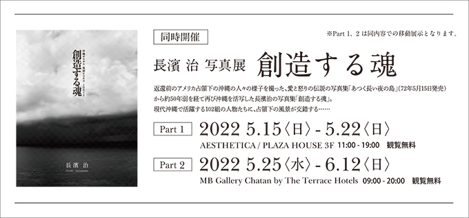 同時開催 長濱治 写真展 「創造する魂」 、返還前のアメリカ占領下の沖縄の人々の様子を撮った、愛と怒りの伝説の写真集「あつく長い夜の島」(72年5月15日発売)から約50年弱を経て再び沖縄を活写した長濱治の写真集「創造する魂」。現代沖縄で活躍する102組の人物たちに、占領下の風景が交錯する……