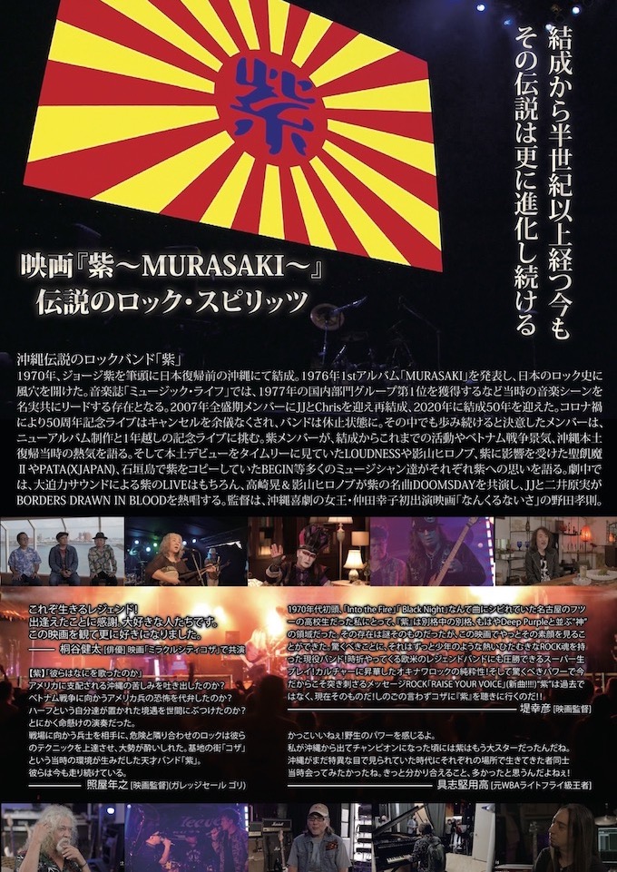 1970年、ジョージ紫を筆頭に日本復帰前の沖縄で結成された伝説のロックバンド「紫」。結成から半世紀以上経ってなお、進化を続ける彼らの活躍を描くドキュメンタリー 映画『紫〜 MURASAKIA〜 伝説のロック・スピリッツ』。沖縄本土復帰50年の年の昨年、沖縄での先行公開を実施! そして満を持していよいよ2023年1月から全国上映がスタートしてます!! 上映情報を更新しました。ぜひ、チェックしてい会場で沖縄ロック伝説を体感してください!!
