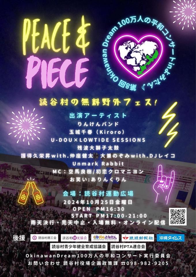平和な沖縄をめざし読谷から平和の願いを広く発信し共有することを目的に、2015年から開催している「100万人平和コンサート」が今年も開催! 第8回 Okinawan Dream 100万人の平和コンサート in よみたんがいよいよ2024年10月25日(金)読谷村総合運動広場にて実施!!