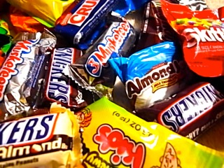 でせしめた戦利品のチョコレートを口いっぱいほうばり、