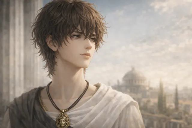 (白のギルドマントをつけた生脚のオクタヴィヤヌス.19歳:オーガスタス帝)