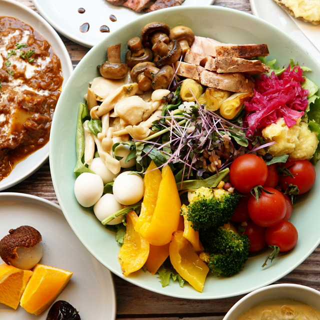 サラダとドリンクとデザートのセットと共に。
