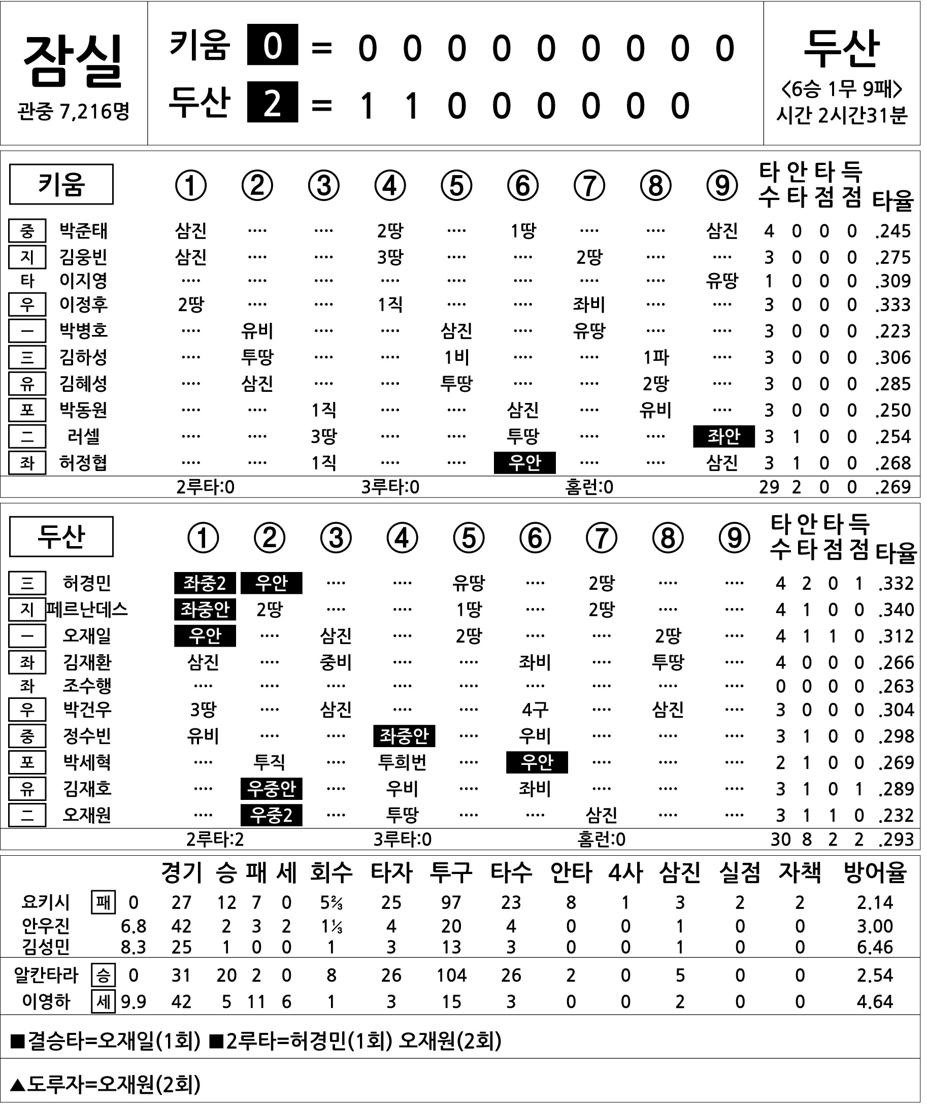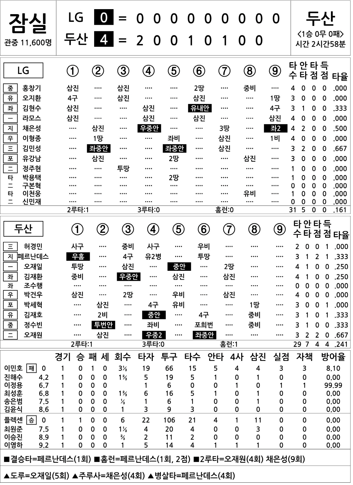 この日は打順に変動があった。キャップを受け継いだ오재일選手は打撃不振、通常5番を打ってるのが8番になっていた。重症ってことか。ここ数年、오재일選手が8番っていうのは見たことがない。