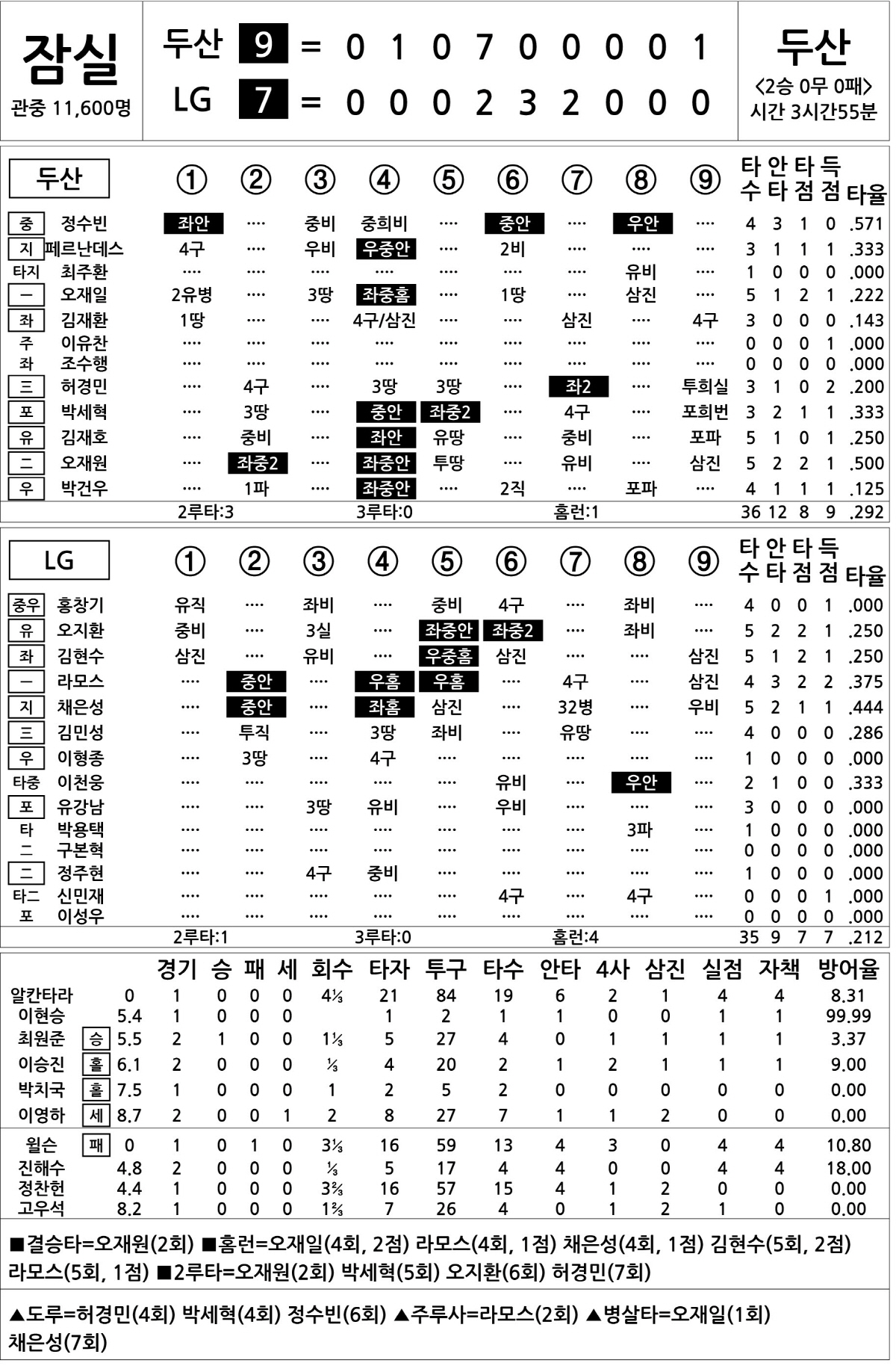 シーズン中はベンチの守り神だった오재원選手がスタメンで、狂ったように打つ。どうしたの?(笑)これがあるから、無下にできない選手だ。