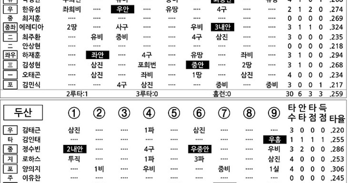 양석환選手は5打席入って結局ノーヒット。승호選手は四球、後続がつないで3点取ったけど、余裕で負けだった。