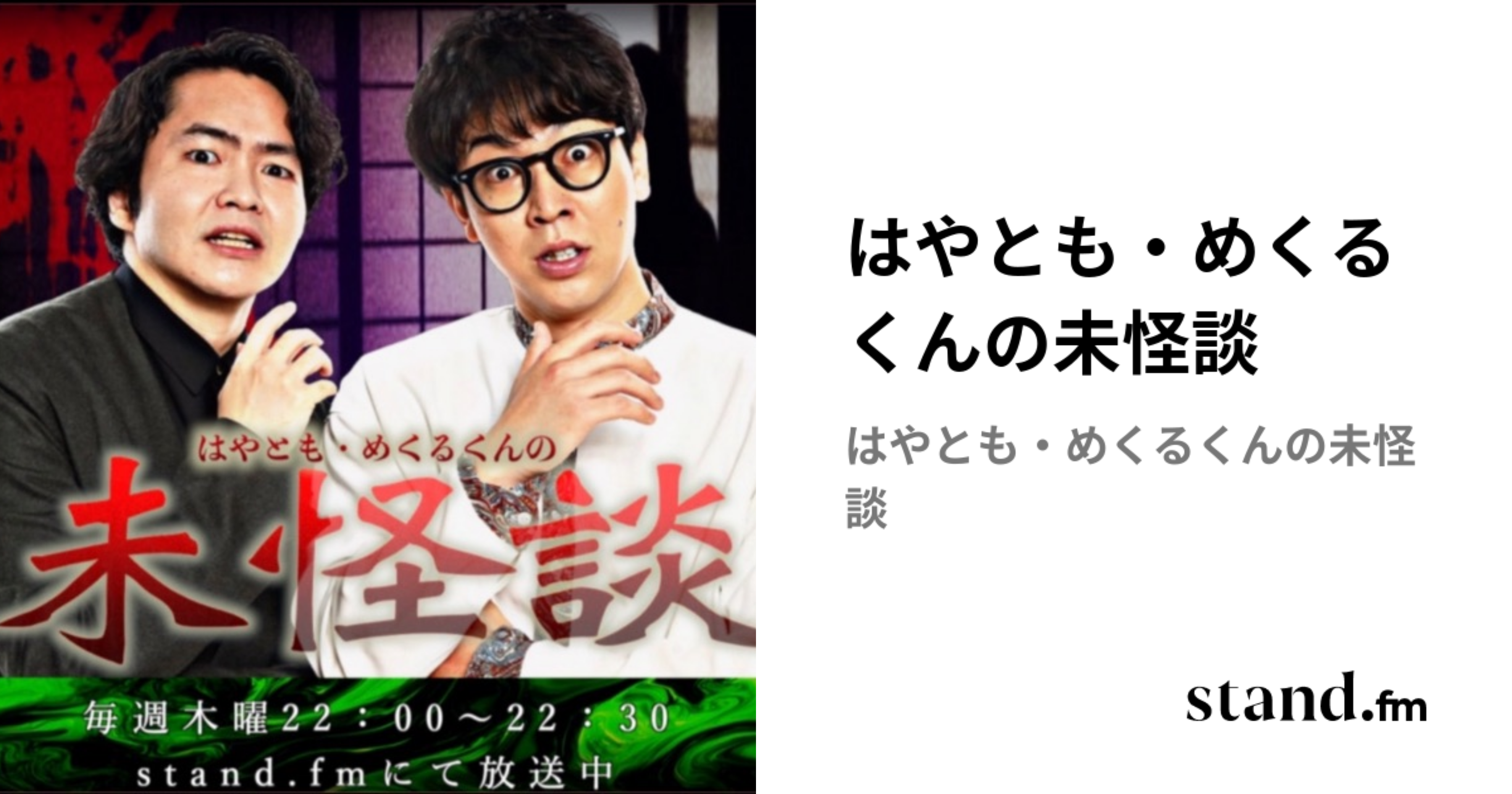 - stand.fm「はやとも・めくるくんの未怪談」:吉本芸人ポンゴの2人とゲストの雑談パートが特に大好き!