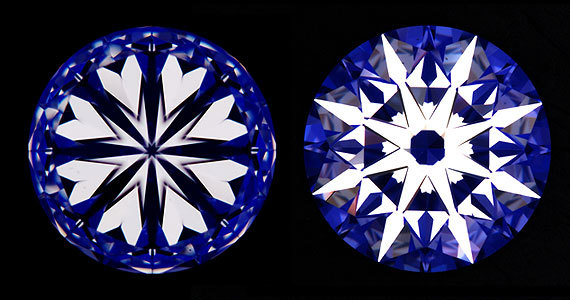 これは対称性のよいダイヤモンドは特殊なスコープで見た際に、裏面には8つのハートマーク、正面から見ると8つの矢形アローマークが対称に現れています。