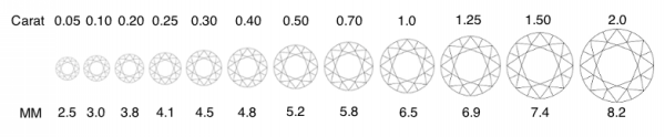 単位は1カラット=0.2gと決められており直径などでも重さを判断することができる為
