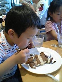 ケイも大きなケーキをペロリ。ママと妹は大好きなアップルケーキ。