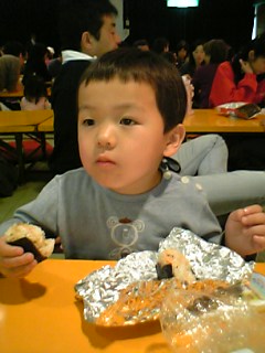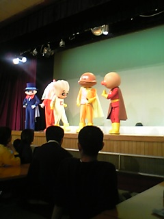 ユウとパパが「絵の具シート」を始めら、アンパンマンショーが始める時刻に。シートを中断して、ショー会場に向かった。事前に席を取っておいたので、前から2列目。そこに座って、作ってきたお弁当を食べた。