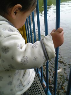 すごい数のコイに圧倒される息子達。