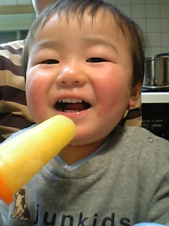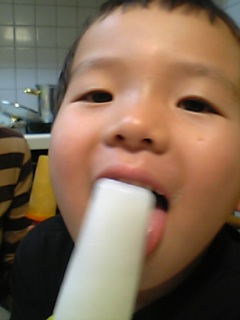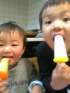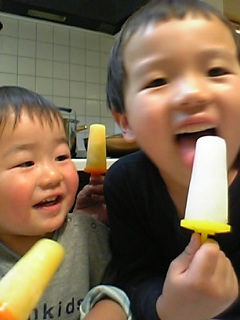 お風呂に入る前に、ユウが「朝作ったアイス食べたい!」と冷凍庫へ。4本作ったアイスを仲良く食べたよ。