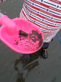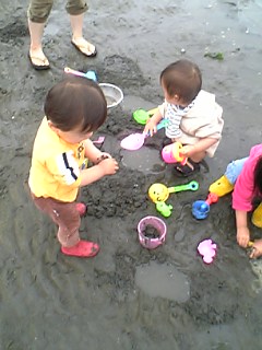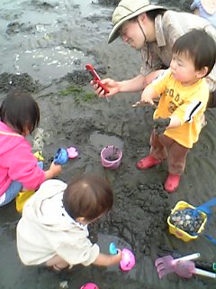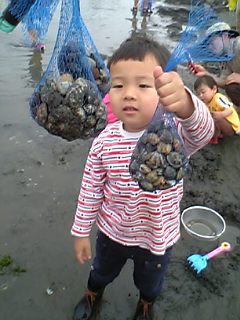 「さぁ、ママも取るかな~。」・・・なんか、おもしろい!宝探しのよう。時間を忘れ、子供の存在も忘れ、ホリホリホリホリ。時間を見ると、1時間半ほど経っていた。「そろそろ終りにしようか?」の頃には、子供達泥だらけ。海から上がり、足洗い場に到着。すぐ側にベンチもあって、オムツ交換が楽だった。車に戻ったら、お茶タイム。(ちなみに2家族で採ったアサリは3.8キロ=2300円くらい)