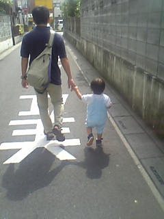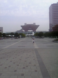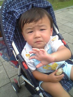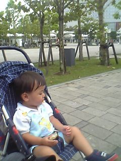 お弁当持参。食べるところあるか心配だったけど、国際展示場前には大きな芝生広場があって、結構食べている人がいた。弁当の中身は、野菜炒め、タコさんウインナー、玉子焼き、おしんこ、オニギリ。お天気も良く、お外で食べるといつもの食事も美味しいようで、息子達もたくさん食べたよ。