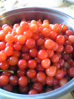 知り合いのお庭にサクランボの木があり、たくさん実がついたということで、お邪魔。皆で木に登り、袋(鍋)いっぱい貰ったよ!小粒だけど、とっても甘いの。