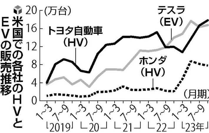 【グラフ】アメリカでの各社のHVとEVの販売推移
