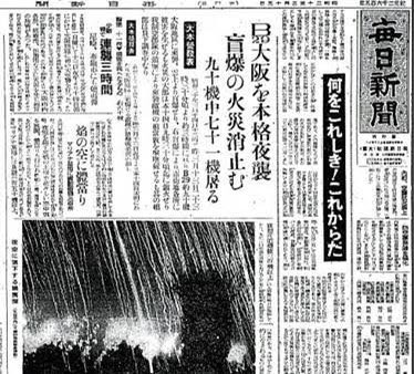 東京に続き、大阪大空襲。米軍のB29爆撃機274機が深夜から翌日未明にかけて焼夷弾爆撃。13万5千戸焼失、死者約4千人。空襲後の大阪市街 左端は南海難波駅、右手前には松坂屋大阪店(現・高島屋東別館)、中央に大阪歌舞伎座が認められる
