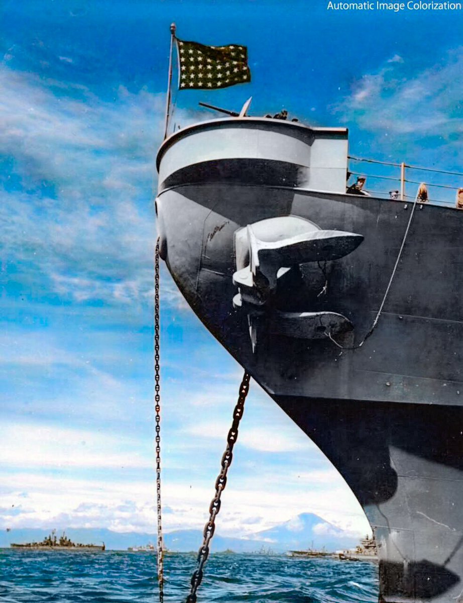 80年前1945年8月30日,相模湾に停泊する戦艦「ミズーリ」の艦首。