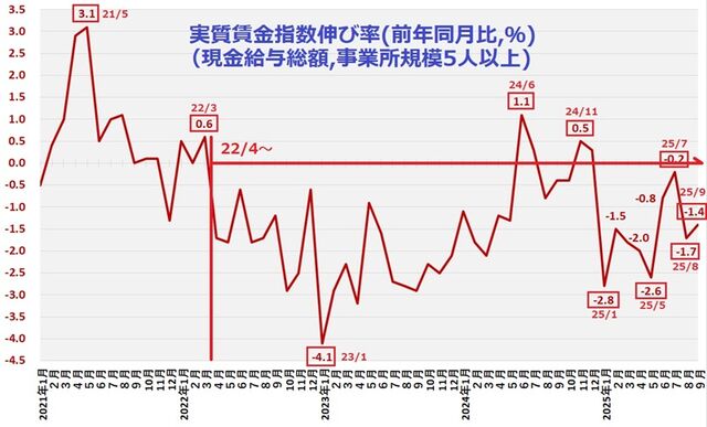 9月の賃金統計が発表されたが9ヵ月連続の減少。