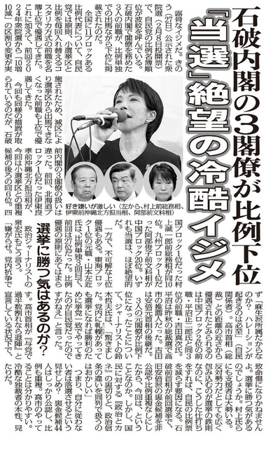 露骨なイジメだ。きのう公示された衆院選で、自民党の比例名簿順位が波紋を呼んでいる。石破内閣で閣僚を務めた3人の前職が、比例単独での出馬ながら下位に掲載されたのだ