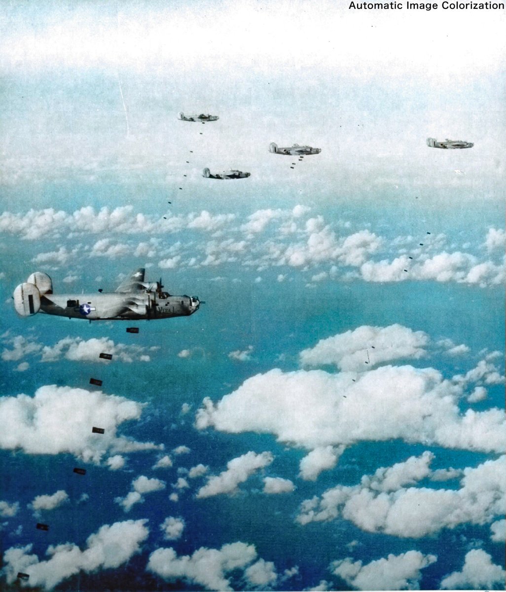 B-24「リベレーター」他の米軍機の編隊が,55ガロンのガソリン入りドラム缶を投下し,