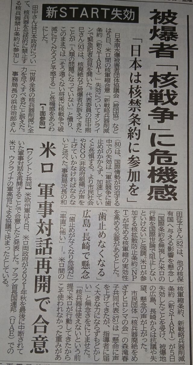 米ロで最後の核軍縮条約失効 被団協「核軍拡競争に歯止めかからず」(朝日新聞)