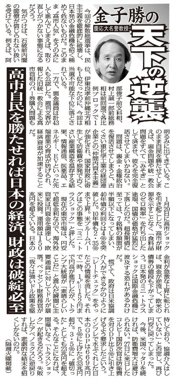 高市自民を勝たせれば日本の経済、財政は破綻必至