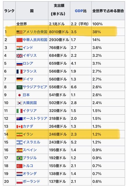 軍事費ベースでいうとイランの軍事予算は