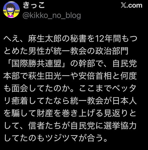 今回の総選挙での高市早苗の行動で異様だと思うのは、「真のお母様文書」や週刊文春の記事などで統一教会と自分や自民党の裏の繋がりが問題視されている中、統一教会系の候補者を避けるどころか重点的に応援演説しているように見えること。頼る先がそこしかないということ