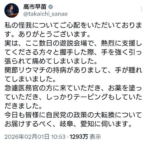 選挙直前の貴重な討論番組をドタキャンした高市早苗さん。 1/31の遊説中に腕を痛め、それで2/1の番組をドタキャン。 しかし1/31の遊説「後」の姿がこちら(動画)。 翌日討論番組をドタキャンするほどの「腕」を痛めている状態のはずだけど・・・ 今朝に急に悪くなったの、謎。お大事に